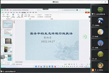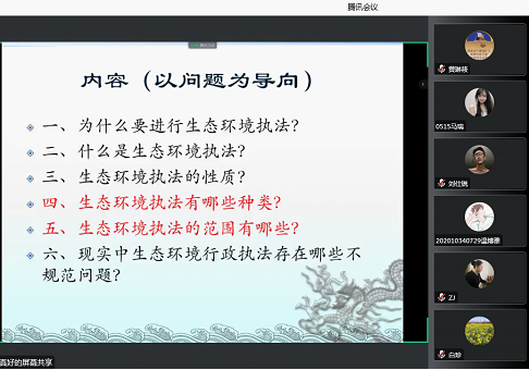 张炳淳主任以社会实务角度出发,提出了“为什么要进行生态环境执法?”、“什么是生态环境执法?”、“生态环境执法的性质?”、“生态环境执法有哪些种类?”、“生态环境执法的范围有哪些?”、“现实中生态环境行政执法存在哪些不规范问题?”等问题,从这些问题入手,以问题为导向从基础概念到实务执法层层递进地来讲解了生态环境执法的经验。