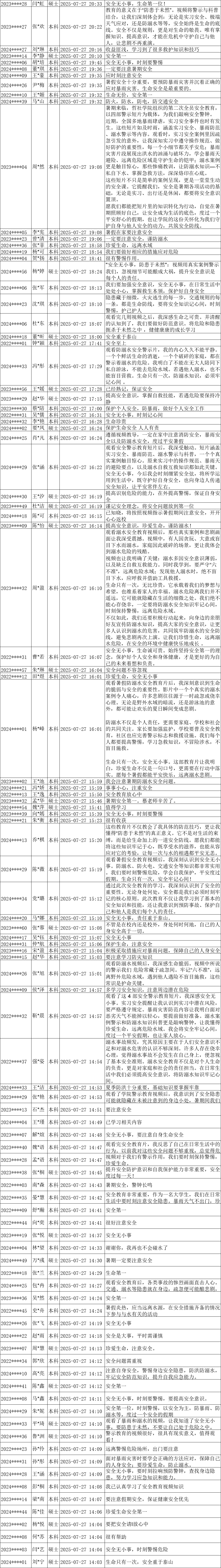 在安全教育过程中,学院深情寄语同学们,希望大家认真观看学习,时刻将安全放在首位,不仅要照顾好自己,也要常给家人报平安。同学们积极响应号召,踊跃参与到安全教育学习中。统计数据显示,4个视频共被浏览观看1807次,累计观看时长达到79小时,充分体现了同学们对安全教育的重视。同时,同学们认真思考,积极填写观后感,共提交142条观后感,表达了自己对安全知识的深刻理解和感悟。